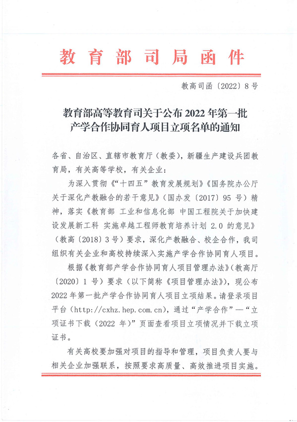 本网讯(通讯员 童光聪)近日,教育部高教司发布了《教育部高等教育司关于公布2022年第一批产学合作协同育人项目立项名单的通知》(教高司函〔2022〕8号),米乐官方网页版_米乐(中国)“基于项目驱动的JAVA教学课程改革”等三个项目获批立项。