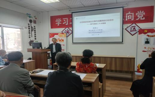 本网讯 为推动党的二十大精神进社区,11月9日下午,米乐官方网页版_米乐(中国)马克思主义学部教授、黄石市委宣讲团成员周青山同志到湖滨社区宣讲党的二十大精神---全面建设社会主义现代化国家的行动纲领。