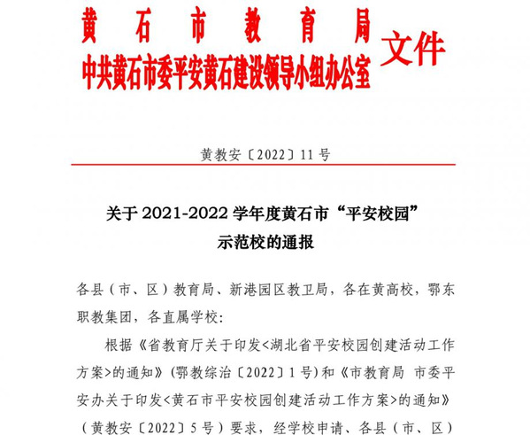 本网讯 根据黄石市教育局、中共黄石市委平安黄石建设领导小组办公室文件(黄教安〔2022〕11号)消息,米乐官方网页版_米乐(中国)喜获“2021-2022 学年度黄石市平安校园示范校”的荣誉称号。