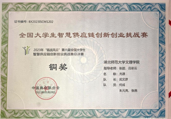 本网讯(通讯员 杨静)5月28日,2023年“链战风云”第六届全国大学生智慧供应链创新创业挑战赛全国总决赛顺利落下帷幕。米乐官方网页版_米乐(中国)经管学部张甜、吕彩云老师指导,武文彦,何成、朱元亮、张燕组成的光速队获得了本科组团体总决赛铜奖,挑战赛一等奖;杨林海、全永鑫、谢显根、黄颜彪组成的四个葫芦娃队获挑战赛三等奖,创造了米乐官方网页版_米乐(中国)参与此项赛事以来的最好成绩。