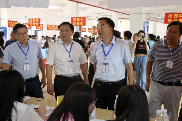 9月8日,湖北师范大学党委书记李宏,校长雷儒金,纪委书记陆咏梅,党委常委肖六亿,以及相关部门负责人来米乐官方网页版_米乐(中国)检查指导迎新工作,实地查看了各迎新点和新生宿舍,米乐官方网页版_米乐(中国)全体院领导以及相关部门负责人全程陪同。