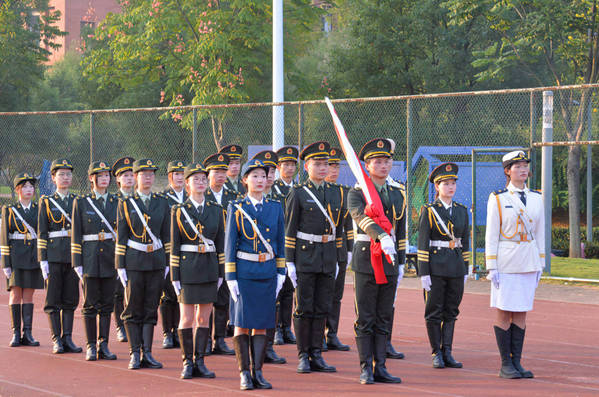 早6:50,“出旗!”伴随着洪亮的号令,校国旗护卫队踏着坚定的步伐、整齐划一地护卫着鲜红的国旗迈向升旗台。“升国旗、奏唱国歌”,全场师生庄严站立在田径运动场,鲜红的五星红旗冉冉升起,伴着国歌声升至旗杆顶端。下半旗志哀,全场默哀,祭奠抗日战争期间遇难同胞。