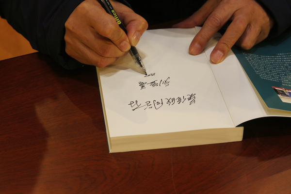 最后,人文学部学子向刘益善献花,刘益善为其最新作品《十八堂课》举办了签名赠书活动。