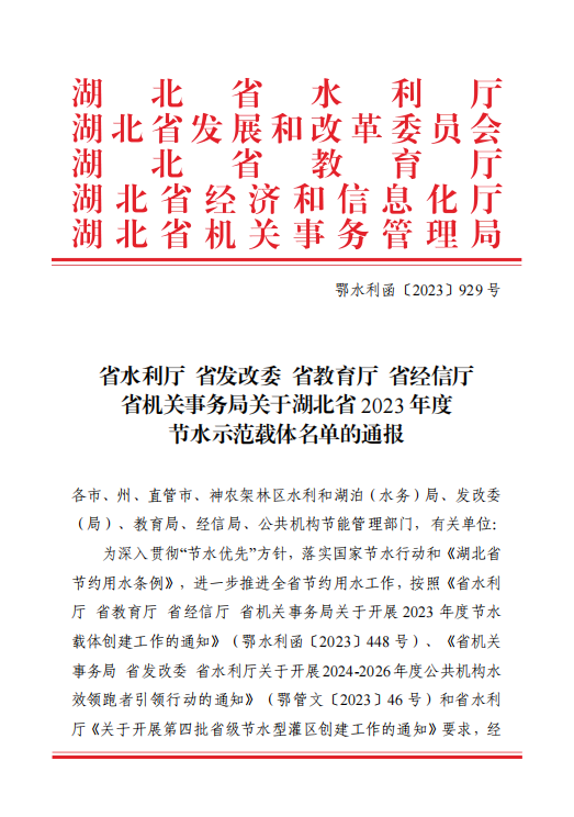 本网讯(通讯员 涂亦乐)近日,省水利厅、省发改委、省教育厅、省经信厅、省机关事务局联合下发文件,米乐官方网页版_米乐(中国)获评“2023 年度省级公共机构节水型单位”和“2023年度湖北省节水型高校”,湖北省仅有16家高校获评。