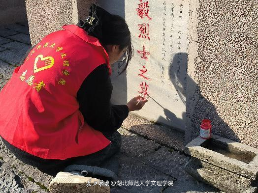 针对墓碑常年裸露在外,一定程度上出现了字体风化的情况,下午,在工作人员的指导下,队员们掌握了描绘技巧和注意事项,对园内的烈士墓碑进行擦拭,描红,描金。经过一下午的努力,烈士墓碑整体变得焕然一新。