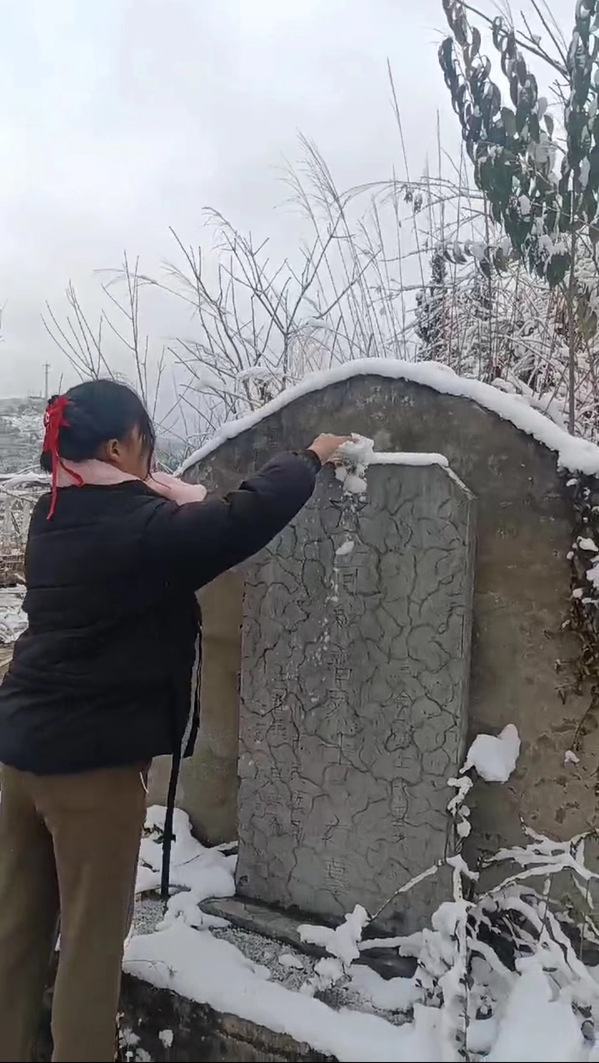 利川市汪营镇,大雪纷飞。在“贺龙智取汪家营纪念碑”前,志愿者默默肃立,随后,他们小心翼翼清扫墓碑上的积雪,擦拭每一座烈士墓碑,清理周边的枯枝落叶和杂草,看到光洁的墓碑、干净道路、整洁的环境,志愿者的寒冷与疲惫一扫而光。