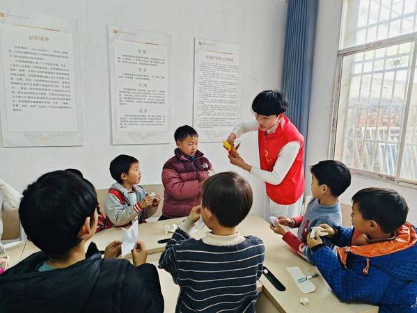 “优能星火队”志愿队员和在村孩童共同体验手工乐趣