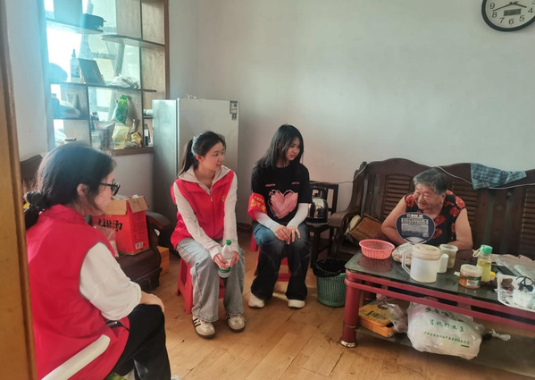 徐凤英住滨湖社区朱家嘴50栋,今年82岁,儿女在外工作,是一位独居老人。当天,志愿者们围坐在徐奶奶老人身边,向老人介绍自己,与老人拉起家常。徐奶奶眼睛亮亮的,看着她们与孙女相仿的年龄,心里格外温暖。“奶奶,现在天气逐渐热了,您出门要注意防暑!”入户前,网格员向青年志愿者们介绍老人的基本情况,指导沟通技巧。