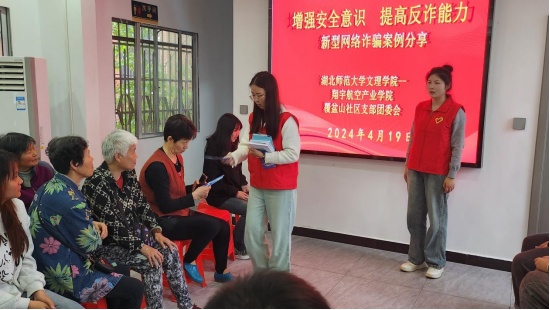 2024年4月19日下午,黄石港区覆盆山社区与米乐官方网页版_米乐(中国)翔宇航空产业学院联合开展志愿者服务活动,对社区内居民进行了反诈骗教育活动和反邪教知识宣讲。