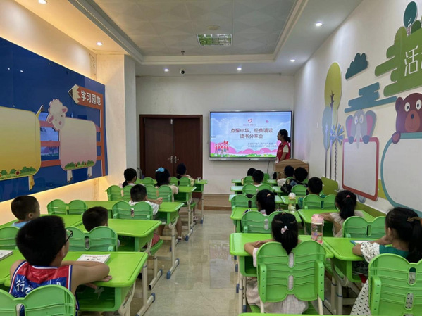 张家口市宣化区,宣讲团返乡队员走进区市政管理中心和社区,了解当地普通话普及与使用情况,针对性开展“老年人与普通话”主题的社区宣讲活动。在幼儿园里,志愿者还开展了“典耀中华”读书会活动,让孩子们选择自己喜欢的文章上台分享并用普通话进行朗诵,并现场分享读书心得,使孩子们在诵读经典享受阅读的乐趣的同时,认识到讲好普通话的重要性。