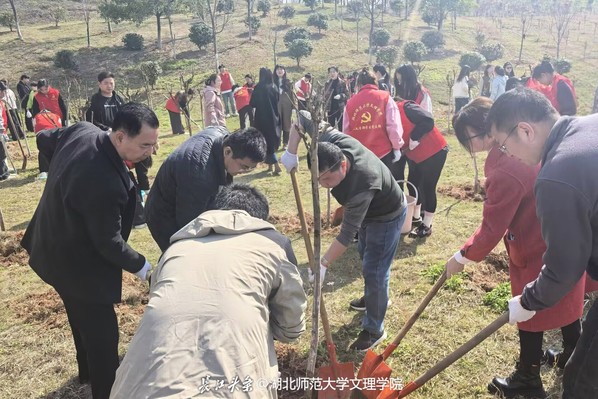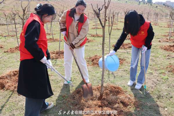 活动开始后,教工党员与学生党员携手并肩,迅速组建起十余个6人协作小组。在专业人员的悉心指导下,大家热情高涨,挥锹铲土、扶苗培土,每一个动作都透露出对绿色生态的深切关怀。整个过程中,专业人员不时提醒着关键细节:“坑的深度要精准控制在30厘米,以确保树苗根系的舒展;回填土需分层踩实,为树苗提供稳固的生长环境;树苗在填土时务必扶正,这是它们茁壮成长的基础。”这些细致入微的指导,让在场的每一位党员都深刻体会到了植树的科学性与艺术性。