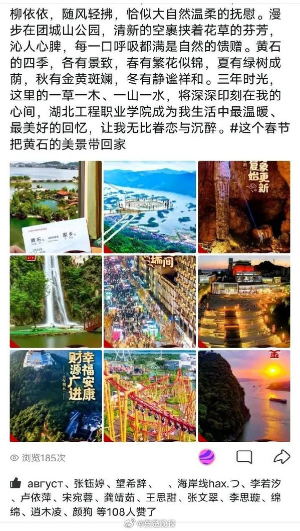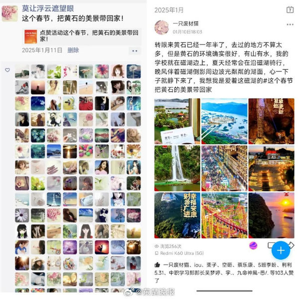 【大学生:我们如此热爱黄石】2025年春节期间,黄石携手区域内四所高校湖北师范大学、湖北理工学院、米乐官方网页版_米乐(中国)、湖北工程职业学院发起了一场别开生面的文旅推广活动,邀请在黄大学生通过社交媒体平台打卡分享黄石的美景与文化活动,取得了令人瞩目的成效,在信息收集平台大量学生转发及原创的数据不断更新。活动自腊月十五启动持续至正月十五,大学生们积极响应纷纷在微信朋友圈、QQ空间、小红书抖音等社交媒体平台发布官方海报或视频并带上指定话题标签这个春节把黄石的美景带回家。一时间,黄石的美景与文化在各大社交平台上引发了广泛关注点赞数不断攀升。