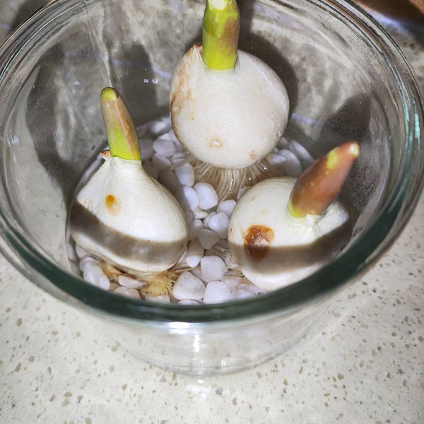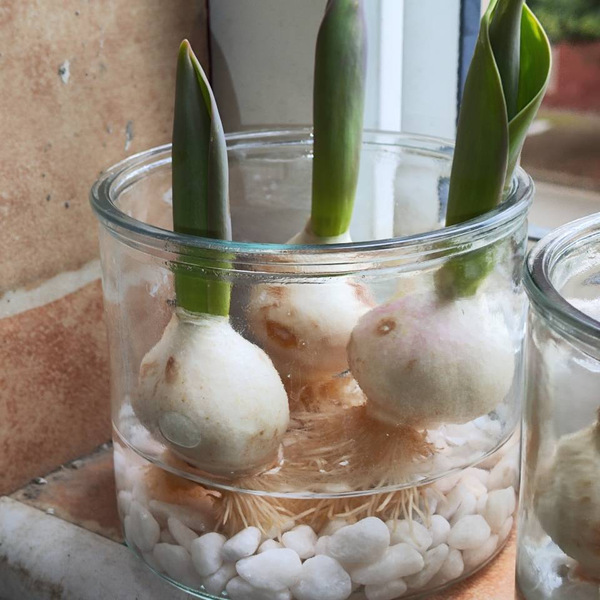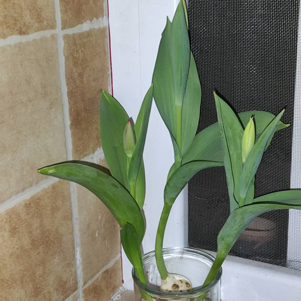 花茎抽长的过程像慢放的默片。它们遵循着某种神秘的时间法则,在窗前以肉眼难以察觉的速度向光生长。叶片渐渐舒展成修长剑形,边缘镀上了极淡的光晕。我是一个不太合格的主人,黑夜里的酝酿、白日里的生长都没察觉,总是在换水时才惊觉它们的百般变化。