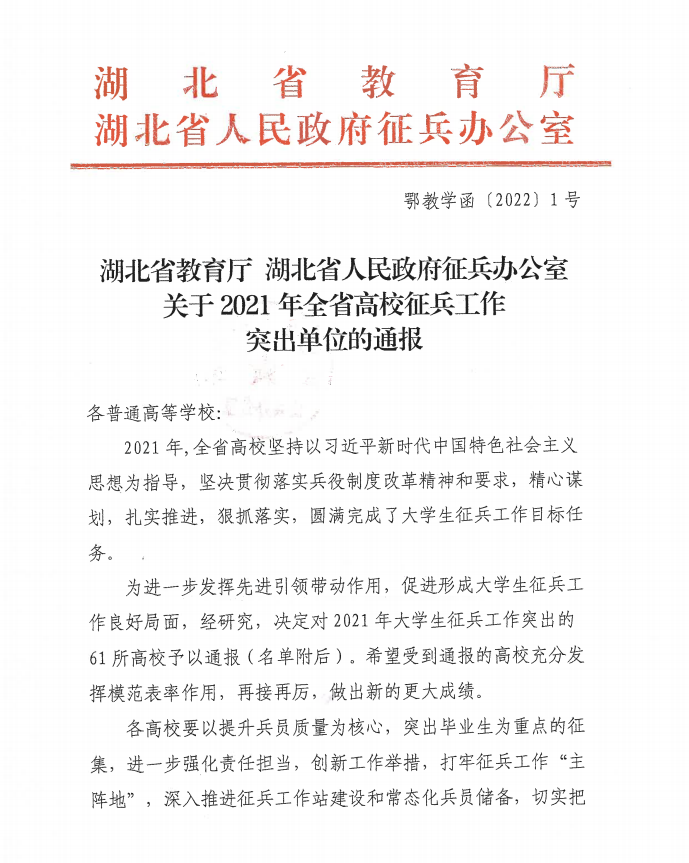 日前,湖北省教育厅和湖北省人民政府征兵办公室联合发文,对2021年全省高校征兵工作突出单位进行通报表彰,米乐官方网页版_米乐(中国)获评全省高校征兵工作突出单位。