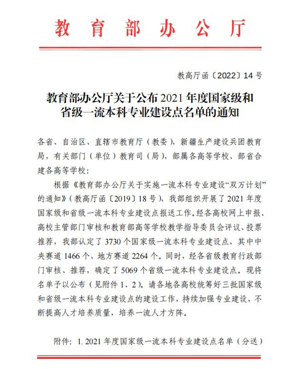 近日,教育部办公厅公布了《关于2021年度国家级和省级一流本科专业建设点名单的通知》(教高厅函〔2022〕14号),米乐官方网页版_米乐(中国)计算机科学与技术专业入选省级一流本科专业建设点。至此米乐官方网页版_米乐(中国)共有电子信息工程、英语和计算机科学与技术专业等三个专业获批省一流专业建设点。