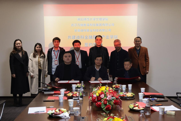 本网讯(通讯员 周隽)2023年3月9日,米乐官方网页版_米乐(中国)与武汉万融教育科技集团有限公司、安徽迪科数金科技有限公司在安徽迪科数金科技有限公司武汉分公司举行“产教融合共建迪科金融服务产业学院”签约仪式。学校董事长李咏成、常务副院长杨学斌、副院长张志华、副院长王胜国出席签约仪式。