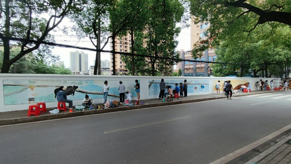 彩绘现场,师生不畏困难,巧妙构思匠心独运,采用彩绘图案和标语相结合的形式,既各有分工又团结协作,手执画笔挥毫自如,经过长达10个小时的绘画,一面40余米长的彩绘文化墙绘让人耳目一新。
