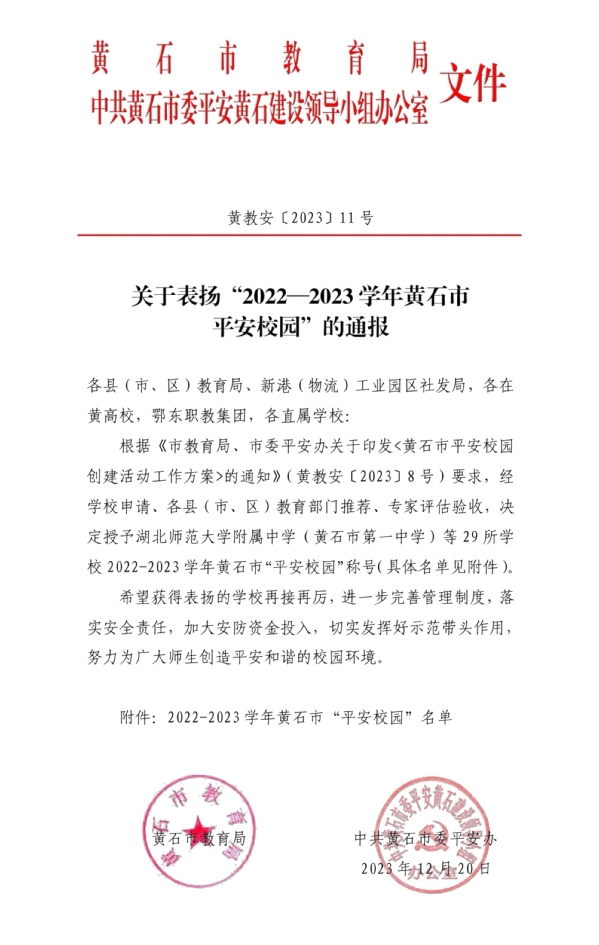 本网讯(通讯员 涂亦乐)根据黄石市教育局、中共黄石市委平安黄石建设领导小组办公室消息,米乐官方网页版_米乐(中国)喜获“2022-2023 学年度黄石市平安校园示范校”的荣誉称号。至此,米乐官方网页版_米乐(中国)已连续2年获评黄石市“平安校园”称号。