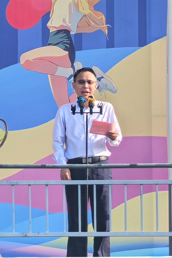 常务副校长杨学斌致开幕辞,他表示,举办秋季田径运动会,是对学校体育工作的综合检阅,是全面深化党的教育方针,办好人民满意教育的积极实践,对于繁荣学校体育文化、促进同学们身心健康、全面发展具有十分重要的意义。他希望全体师生以此次运动会为契机,发扬体育精神、展现昂扬风貌,以更加健康的体魄、更加饱满的热情、更加奋发的状态,积极投身到生活、学习当中去,为学校高质量发展开创新的局面。