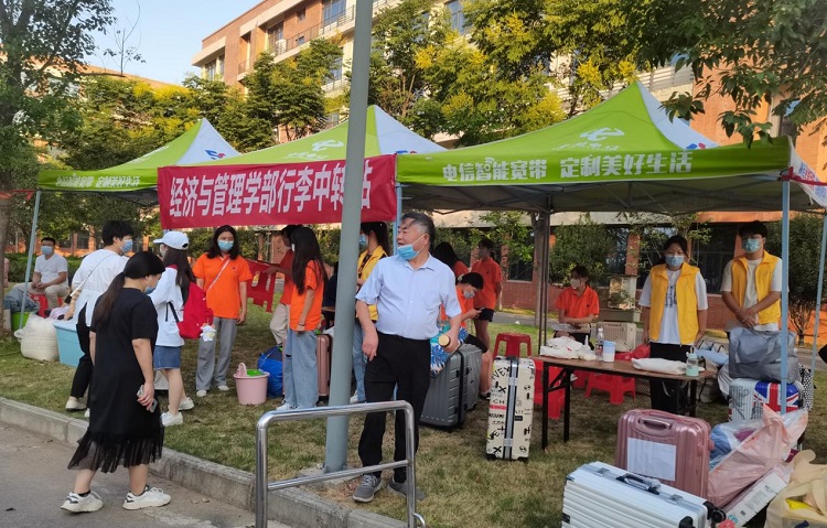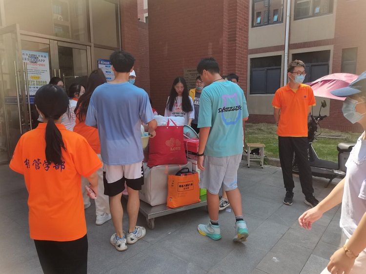 疫情防控尤当紧,为迎接新生的到来,米乐官方网页版_米乐(中国)做足了准备。学校在火车站、汽车站设立接待点,安排了大巴车将新生与家长送至学校;在校内迎新联合办公室内设置了各学部迎新点,在2号实验楼与行政楼之间设置了各学部行李中转站。在经管学部主任商树松的领导下,学部在校内各点均配备了迎新教师和志愿者。学生和家长一到达学校,校门口的志愿者们便立刻上前迎接,引导他们去迎新联合办公室学部迎新点办理报到手续,办理完手续再帮助新生把行李搬运上接驳车送至宿舍楼,宿舍楼下早已有志愿者们等候,帮助新生将行李点对点搬至各宿舍。经管学部的志愿者们身着亮丽的橘红色志愿者服装,他们不怕炎热,不辞辛苦,校门口、学部迎新点、行李中转站、学生宿舍楼下等地方都流动着他们忙碌的身影,那一抹橘红色为学校增添了一道亮丽的风景线。