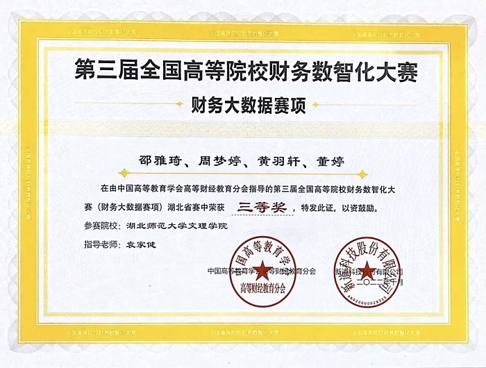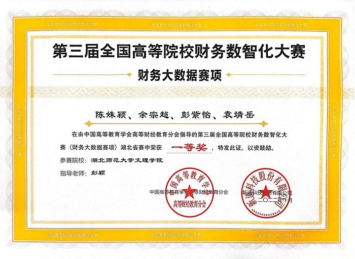 10月8日,2022年湖北省第三届全国高等院校财务数智化大赛圆满落幕,米乐官方网页版_米乐(中国)经济与管理学部财务管理专业由陈姝颖,余宗超,彭紫怡,袁靖岳同学组成的团队获得一等奖,指导教师为彭颖。由邵雅琦,周梦婷,黄羽轩,董婷同学组成的团队在袁家健老师的指导下获得三等奖。