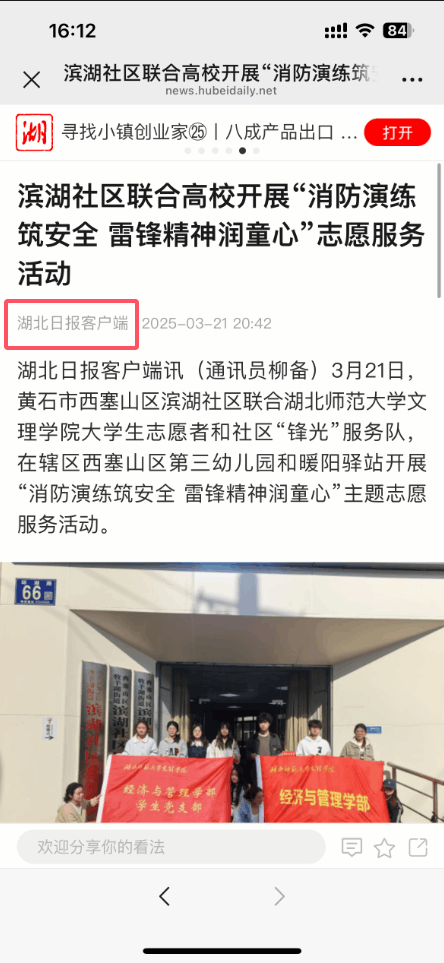 此次活动不仅增强了孩子们的消防安全意识,也让雷锋精神在志愿服务中得到传承与弘扬。同时,活动获云上黄石、湖北日报客户端报道,彰显了社会各界对校社合作的认可与支持。未来,经济与管理学部将继续深化校社共建,整合多方资源,打造更完善的志愿服务体系!