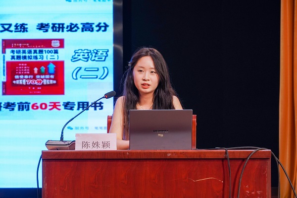 紧接着,五位成功“上岸”的2021级学子依次登台,结合自身考研经历,深入讲解各阶段备考要点。财务管理陈姝颖以优异成绩考取重庆科技大学会计专业,系统分享了199管理类联考的备考策略,涵盖基础巩固、技巧提升、冲刺复盘等阶段,并推荐多部实用复习资料;财务管理余宗超围绕政治、英语及396经济类联考复习要点,特别强调时间管理与复习节奏,建议制定切实可行的计划并科学选用辅导资源;财务管理邵雅琦从财务管理专业跨考至贵州大学植物营养专业,分享了择校定位与跨专业备考的具体策略,尤其对调剂流程进行了详细说明;经济学陈伟杰考入江西财经大学金融学专业,结合自身经验讲述英语、政治、数学(三)及专业课的学习方法,强调计划分阶段、作息有规律的重要性;经济学郭佳怡被东北林业大学农村发展专业录取,围绕信息搜集、学校选择、复试准备等方面为同学们提供了全流程指导。会上,五位同学分别就现场同学提出的考研方面的困惑进行了互动交流。