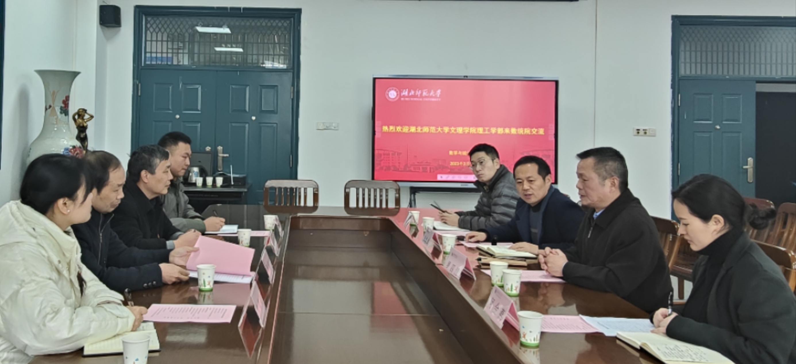 2023323日,理工学部主任傅朝金、党总支副书记肖圣芳,教工党支部书记朱翠红、学生党支部书记罗德天一行前往湖北师范大学数学与统计学院学习全国样板支部建设的工作经验。数学与统计学院也非常重视此次经验交流并专门组织了交流会,院长吴爱龙、党委书记罗四清、党委副书记王本成、综合办公室主任续林、学生第一党支部书记何金燕、辅导员杨宇森出席了此次交流会,并在会议室举行了隆重的欢迎仪式。随后何金燕老师带领我们参观了数学与统计学院党员活动室以及样板支部建设的展板,并交流了他们获评“全国首批高校建设工作样板支部”的宝贵经验。