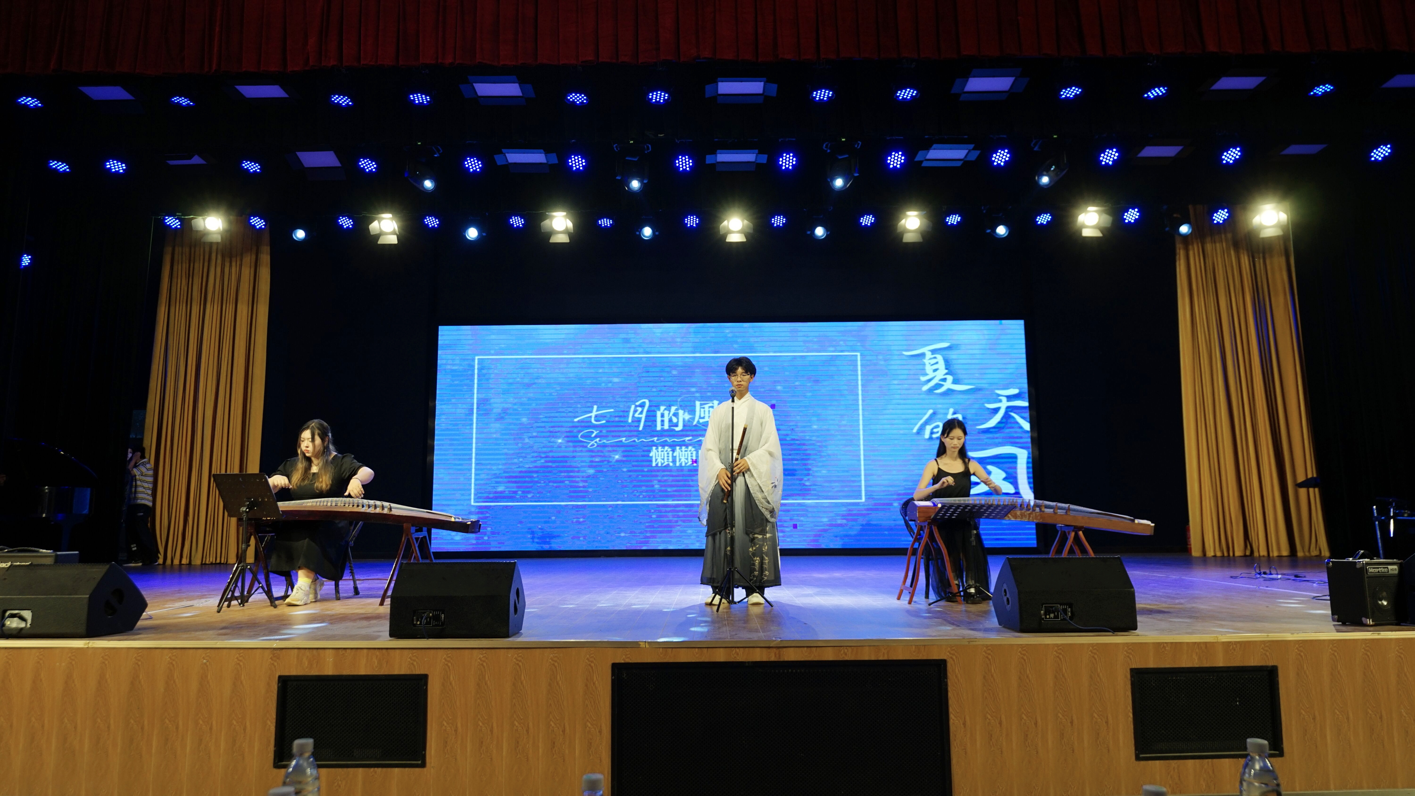 首先,优秀毕业生代表余官琴同学发言,为即将踏上人生崭新旅程的理工学子送上最真挚的祝福,并寄语毕业生发扬自强精神,擦亮爱国奋斗的青春底色,与时代偕行,努力书写更加精彩的人生篇章。整场晚会主要以“青春回忆”和“青春绽放”两个篇章串联,节目涵盖歌曲、乐队、舞蹈、器乐、独奏、合唱等多种形式,内容丰富,形式多元,异彩纷呈,既展现了理工学子的蓬勃朝气和文艺才能,也表达了对校园的无限热爱和深深眷恋。一支动感活泼的舞蹈《Diamond》拉开晚会序幕,聚焦了观众的目光,并将现场气氛点燃。丝竹管弦类节目诗意盎然,演奏的吉他弹指《Something just like this》动人心弦,古筝笛鸣《夏天的风&芒种》乐声璀璨,旋律悠扬;典雅优美的《Letting go &红色高跟鞋》述说着毕业生们对美好时光的留恋与不舍;一首钢琴小提琴合奏《路小雨-不能说的秘密》用默默的爱诉说着对这个夏天的告白。随着中场舞蹈《Feel my rhythm》在斑斓的灯光下摇曳,第一篇章暂告一段落。