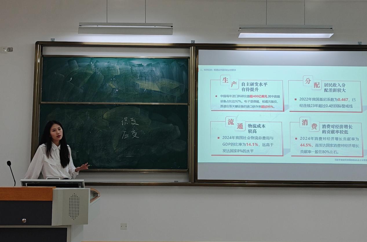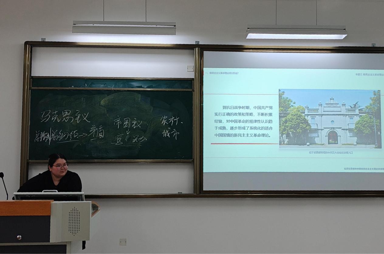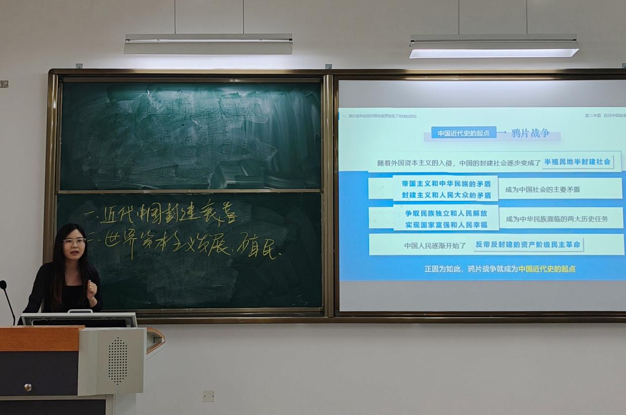 思政组唐见平、邓小钇、刘茜、陈文丽老师,分别以“新民主主义社会如何向社会主义过渡?”“鸦片战争前后的中国与世界”“从《大决战》看新民主主义革命理论的历史实践”“新发展格局——应变局开新局的战略选择”为题进行教学展示。比赛过程中,四位青年教师通过精心的讲解、富有感染力的语言表达,普遍表现出较强的课堂驾驭能力,同时展现了各自的教学特色。