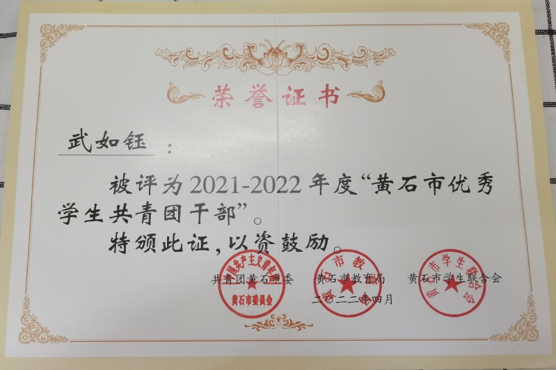 武如钰同学被评为黄石市优秀学生共青团干部