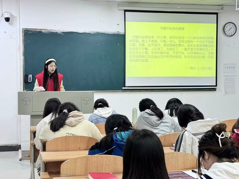 学生党员覃如苗在历史学2301班宣讲时谈到:“持之以恒地保持规律的作息对身体健康非常重要,需要进行自我调整并建立健康的作息。”她与同学们进行了贴心的交流,提醒大家加强身体锻炼,多出门亲近大自然并鼓励同学们努力学习养成良好的生活习惯。通过党员同志的演讲,同学们也深刻意识到熬夜给自身带来的危害之大。