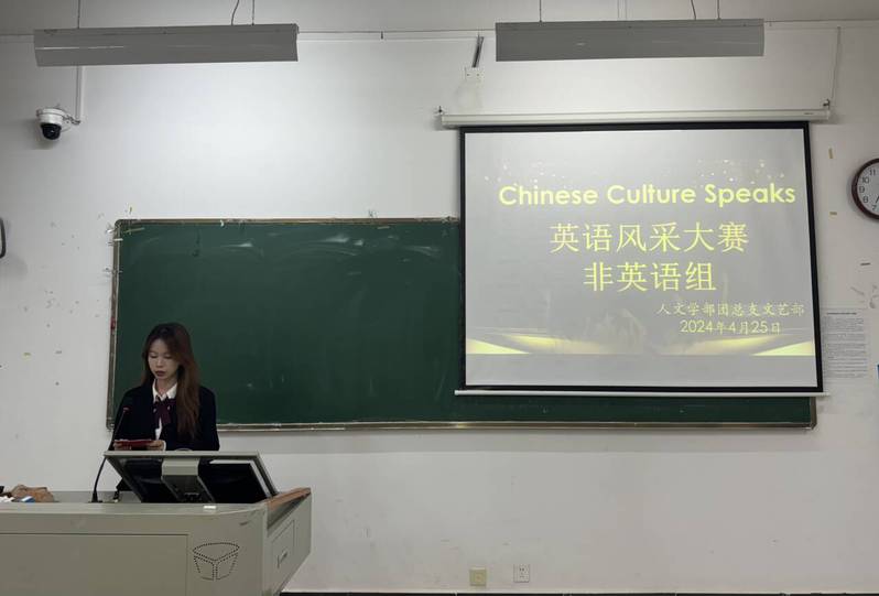 英语作桥梁,文化传世界。为丰富校园文化生活,创设良好的英语活动氛围,提升同学们对英语学习的兴趣,给学生提供展示个性、发挥特长、展现英语风采的平台,人文学部于4月25日晚在教学楼 1A201、1A203举办以“Chinese Culture Speaks”为主题的英语风采大赛。此次活动旨在激发大学生对祖国、对中华传统文化的热爱之情,提升学生的文化自信,传递中国文化正能量。