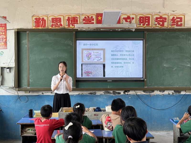 生动课堂,情暖心间。上午9时,学生党员尹雪倩同志围绕日常安全问题,心理健康状态等方面对同学们进行了生动精彩的讲授。随着小课堂PPT逐步深入的引导,同学们听讲和举手答问的积极性显著提高。游戏互动环节,学生党员覃如苗同志带领学生们进入“巧手小课堂”——送你一朵小“红”花。学生亲手参与制作花朵和贺卡,送给自己最重要的人,记录下送花时的感受和祝福。为间接了解近期学生的心理状况,尹雪倩同志让小朋友们把自己的烦恼写在小纸条上并投入纸盒子里,带领学生分享感受,并鼓励他们珍惜时光、发奋学习,同学们接过满载爱心的礼物,脸上洋溢着幸福的笑容。