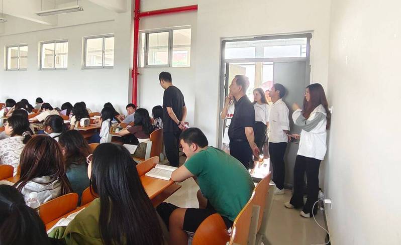 端午假期将至,假期相关工作陆续展开。为进一步加强宿舍安全防范教育工作与检查学期学风建设成果,人文学部主任熊子延教授、党总支书记周景斌老师组织带领学部教学秘书、全体辅导员进行查课、宿舍走访活动。