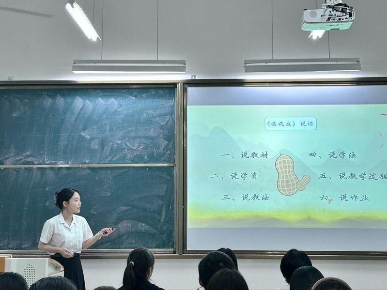 汉语言文学专任教师刘赵莹、李淑慧、李平三位老师担任语文组评委,选手聚焦中小学语文教材经典篇目展开说课。从教材分析、学情把握、教学目标、重难点突破等维度,呈现“大单元教学”“任务群设计”“群文阅读”等前沿理念。部分选手结合朗诵示范、小组探究、情境写作等互动环节,展现“以学生为中心”的课堂建构能力,现场教学氛围热烈。点评环节,李淑慧老师特别强调“说课与讲课的区别”,指出说课需突出“教什么”“怎么教”“为什么这样教”的逻辑链条,为选手规范说课流程。三位评委分别从“文本解读深度”“学情分析针对性”“板书设计创新性”等方面提出建议,既肯定“教学热情饱满、环节设计完整”的亮点,也针对“理论支撑不足”“重难点阐释模糊”等问题给出改进方向,助力选手明晰师范生说课的核心要素。