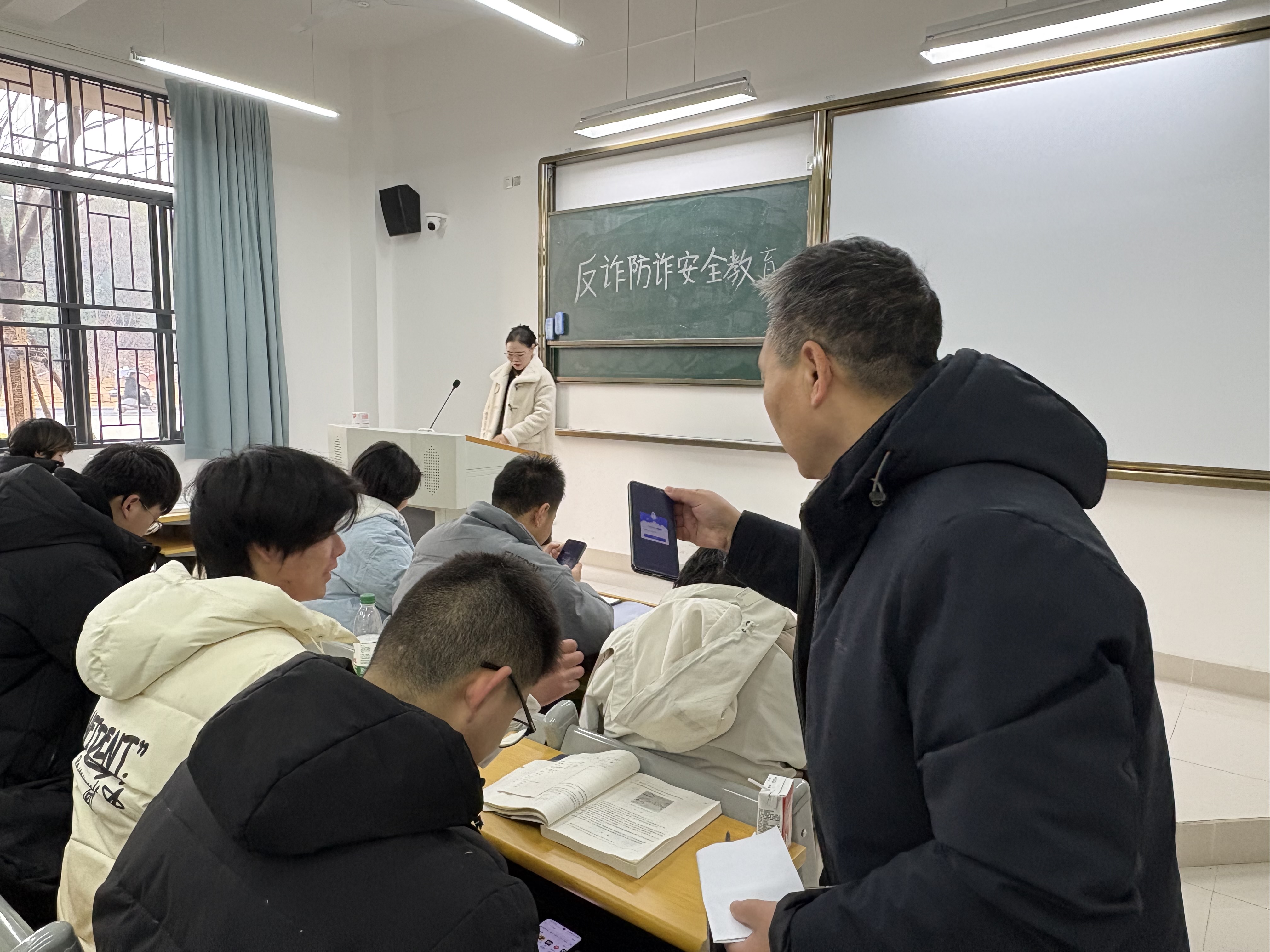 2025226日早上750分,学部党总支副书记肖圣芳走进电气工程专业课堂,利用课前十分钟开展“反诈防诈 守护平安”主题宣讲活动,带头引领学学部安全教育工作走深走实。肖书记结合近期高校典型案例,深入剖析“刷单返利”“虚假购物”“AI换脸诈骗”等新型诈骗手段,揭示了诈骗分子话术套路。他强调:“反诈防诈不仅是个人安全的必修课,更是新时代青年理性运用网络、守护社会责任的体现”。肖书记还现场抽查学生“国家反诈中心APP”下载情况,叮嘱大家“不轻信、不转账、不泄露”,筑牢思想防线。此次肖书记带头宣讲,进一步强化了“全员参与、全程渗透”的反诈教育格局,为辅导员老师进入课前十分钟进行宣讲作出了示范,也为学生利用课前十分钟自主开展安全教育活动树立了鲜活的榜样。