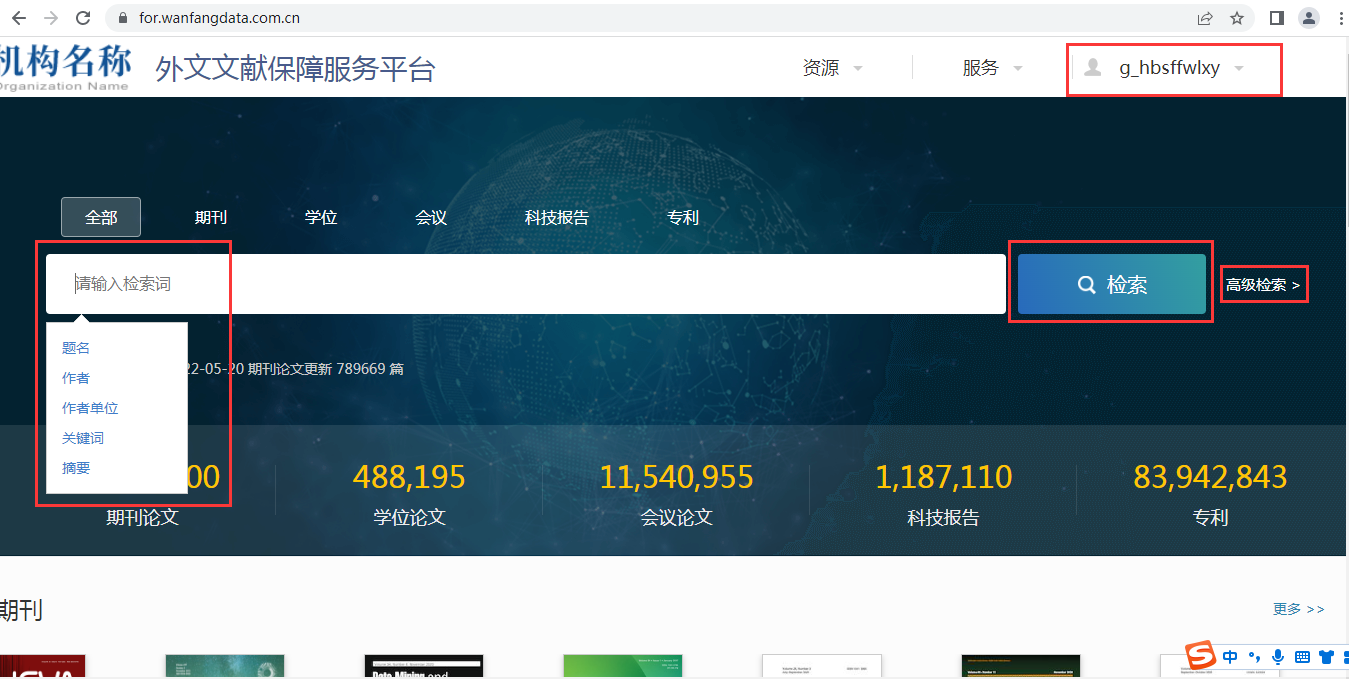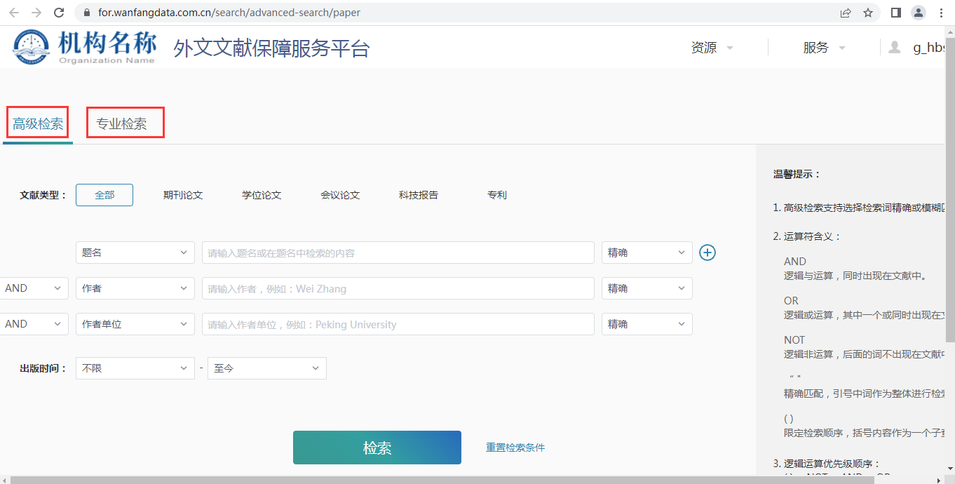 2. 在学校IP范围内会自动登录,可通过关键词进行模糊查询,也可以通过高级检索/专业检索进行精确查询。