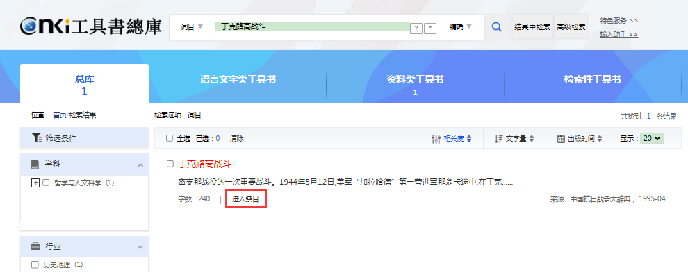 检索结果左侧展示检索结果的分组,包括学科、行业、书目、出版者、更新年度、其他的子产品,移入展开按钮,可以查看全部分组内容。右侧为检索结果列表。点击条目名称或“进入词条”则进入条目详情页。