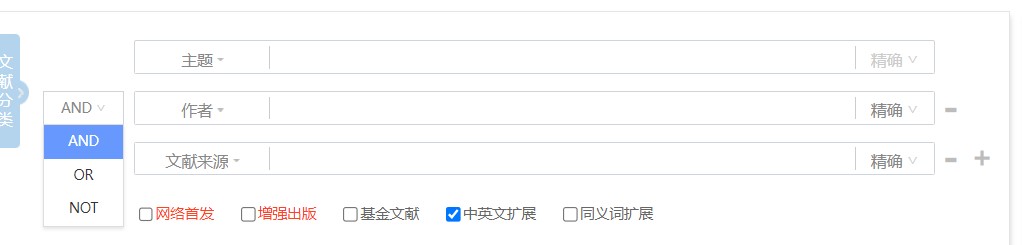 (3) 完善检索细节,如:一框式检索、高级检索支持同一检索项内输入*、+、-、''、""、()进行多个检索词的组合运算;完善及新增多项智能引导,包括主题、作者、机构、基金、期刊等检索引导。