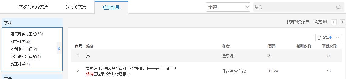 设置检索条件,如主题、题名、作者、关键词等,输入检索词后,点击检索按钮,可在本报内检索,出现“检索结果”版块,如图4.8.5.4所示。左侧展示检索结果的分组,包括发布年度、学科、单位,移入展开按钮,可以查看全部分组内容。右侧为本报内检索结果列表。