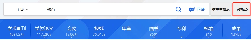 总库检索后,点击各资源类型名称,下方的检索结果区即为该资源类型文献。