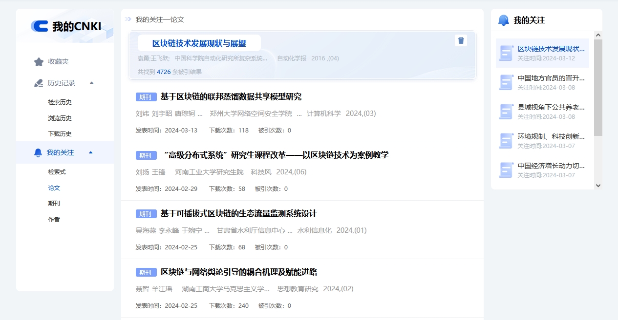 登录个人账号后,可在检索结果页点击“主题定制”,或在“我的CNKI-历史记录-检索历史”点击检索式的“关注”按钮,关注检索式。进入我的CNKI-我的关注-检索式,可查看检索式下的文献,管理已关注的检索式。