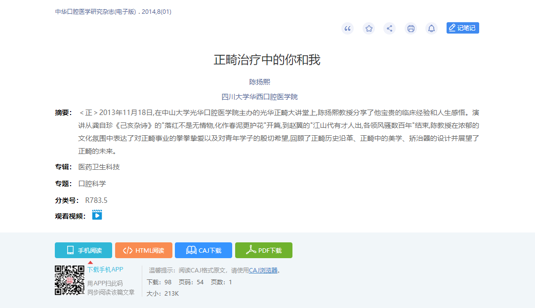 论文关注页面显示已关注论文的题名、作者、机构、来源、出版年及引证文献数,并显示引证文献的类型、题名、作者、机构、来源等信息。点击文献标题,跳转至该文献知网节页面。鼠标悬停到某篇文献,点击按钮可下载或收藏该篇文献。