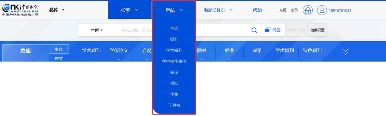 鼠标移入页头“总库”,显示总库及各单库名称,点击进入总库及各单库个性化首页。