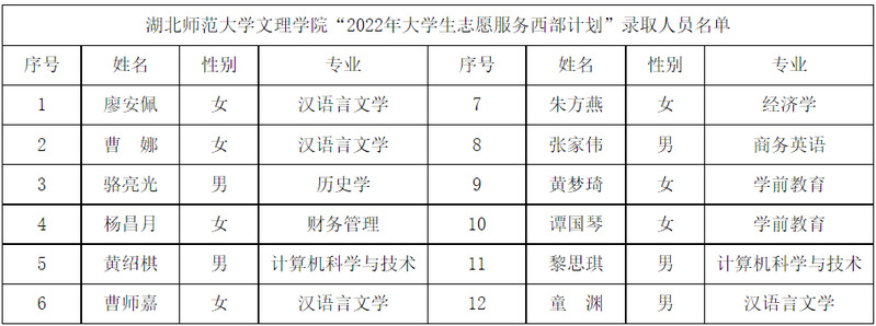 根据共青团中央、教育部、财政部、人力资源社会保障部《关于印发<2022—2023年度大学生志愿服务西部计划实施方案>的通知》的相关部署和工作安排,米乐官方网页版_米乐(中国)在公开招募、自愿报名的基础上,严格招募选拔流程,经资格审查、笔试、面试、心理测试、体检等环节,拟录取廖安佩等12名米乐官方网页版_米乐(中国)应届毕业生为2022年大学生志愿服务西部计划志愿者。