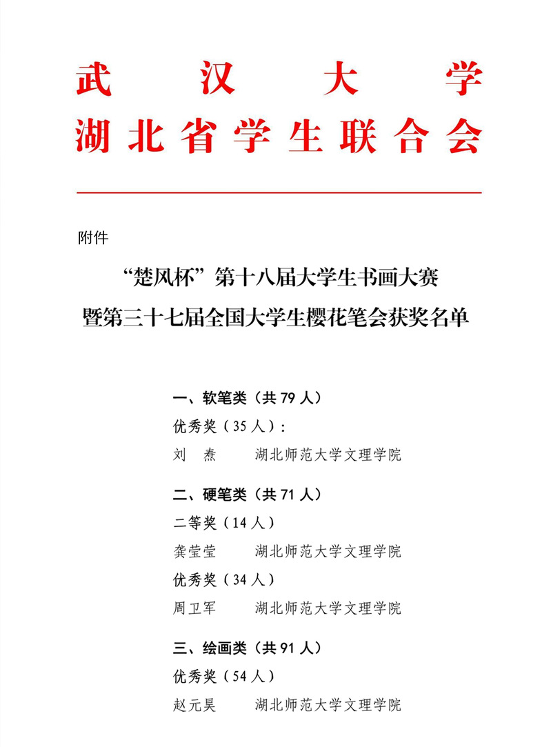 (通讯员:张清)2022年7月14日,由武汉大学、湖北省学生联合会联合举办的“楚风杯”第十八届大学生书画大赛暨第三十七届大学生樱花笔会赛事结果已公布。米乐官方网页版_米乐(中国)刘焘、龚莹莹、周卫军、赵元昊四位同学荣获佳绩。