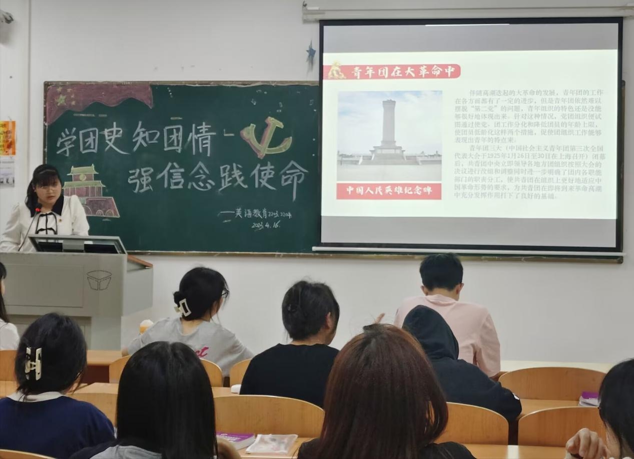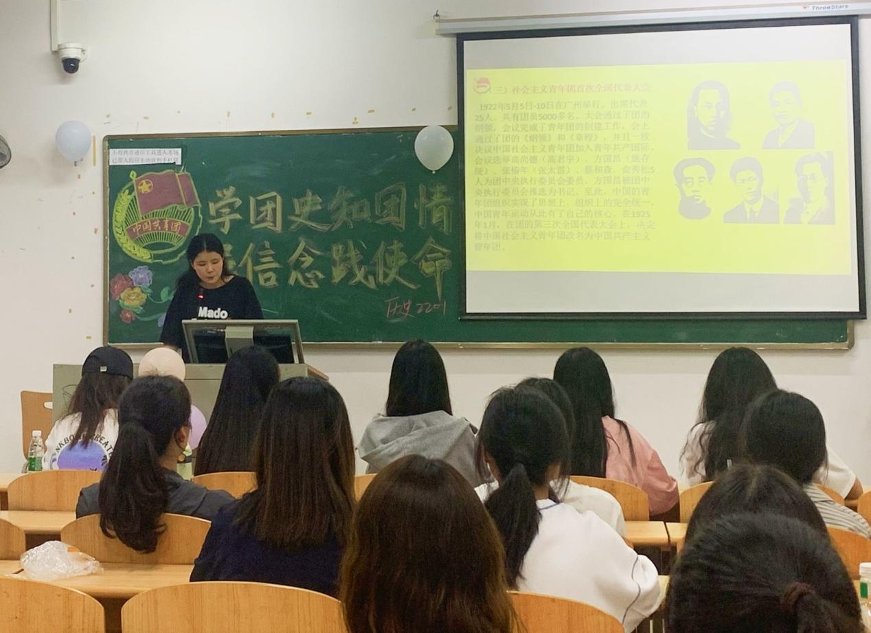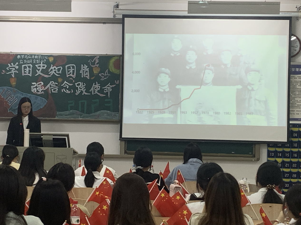 活动在高昂的共青团歌声中拉开序幕。随之,各班主持人通过播放相关视频、朗诵诗歌等形式,帮助同学们深入了解中国近代革命历史和青年运动的发展历程,增强同学们对共青团的认同感与爱国主义意识,引导同学们坚定理想信念、刻苦学习、奋发成才。