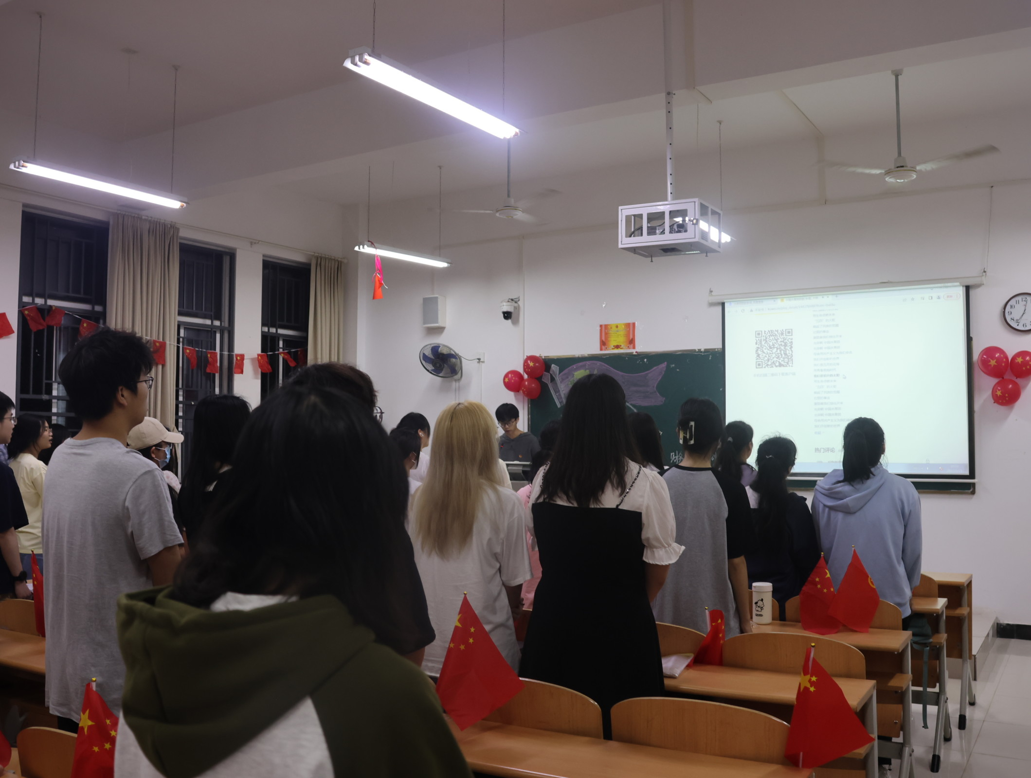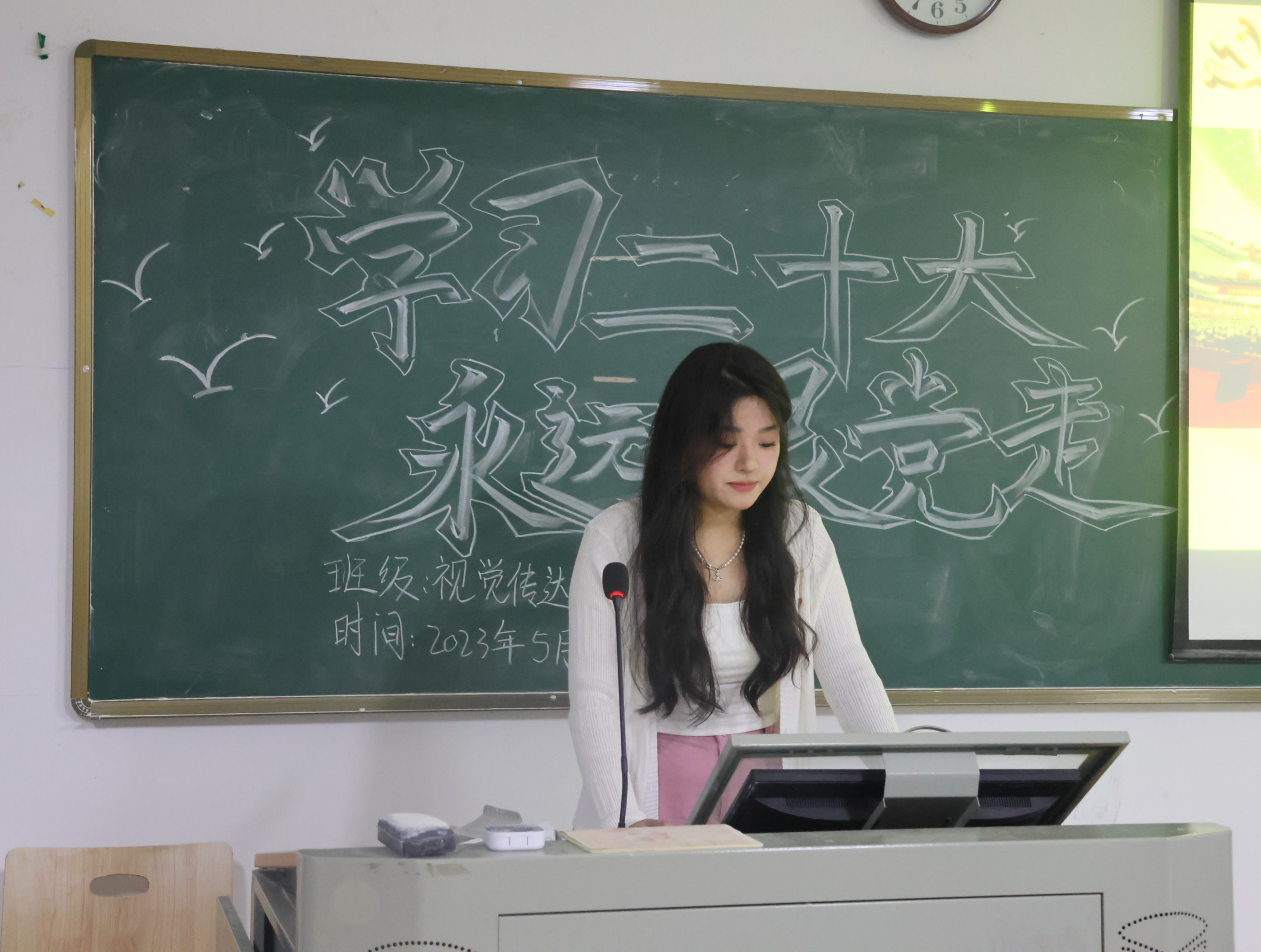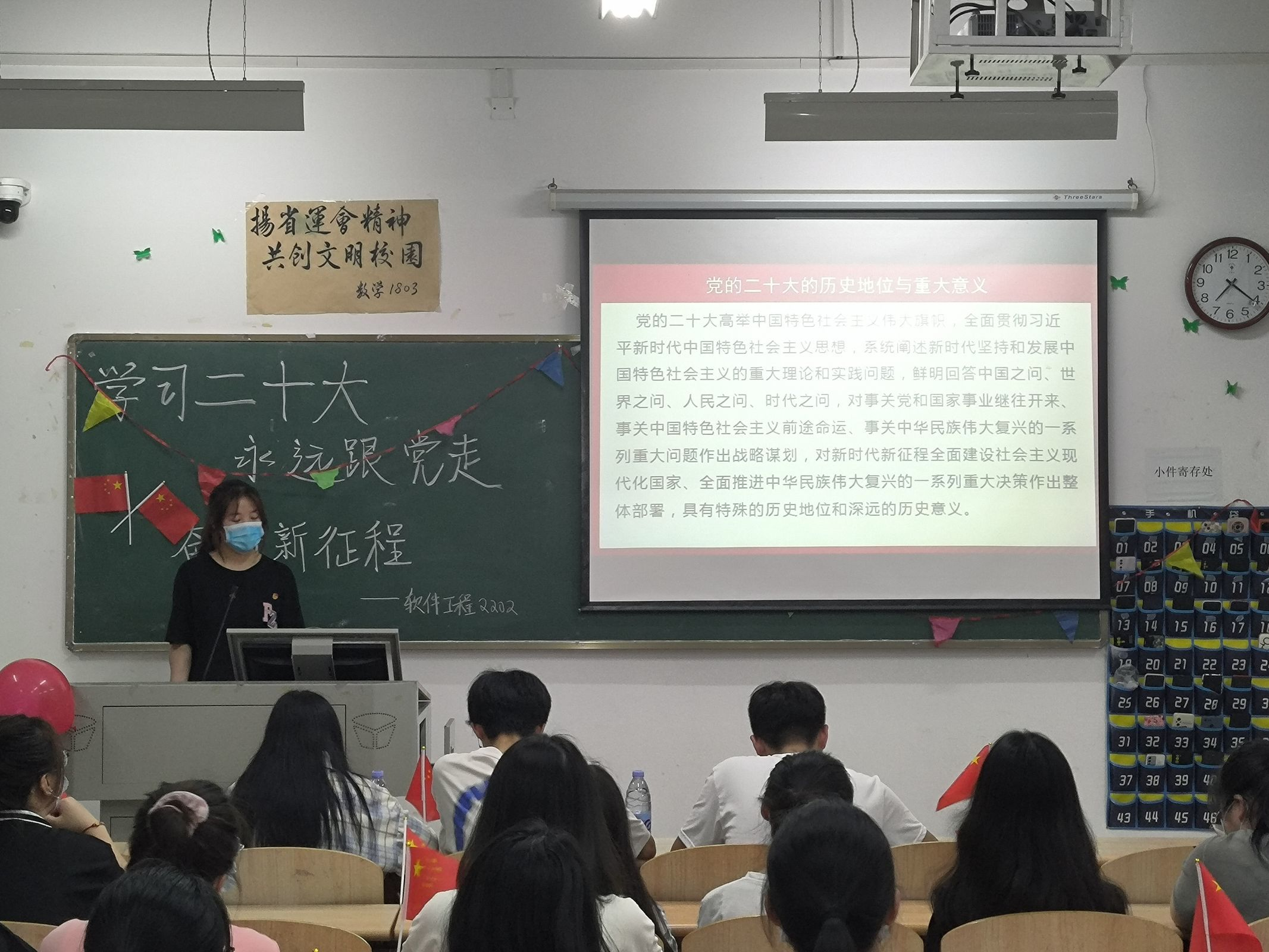 各班主持人以播放相关视频、朗诵诗歌等形式,带领同学们进一步学习二十大和了解二十大,引导同学们坚定理想信念,将理论与现实相结合,把二十大精神贯彻到日常生活的每一个方面,为伟大复兴的中国梦注入青春的力量。