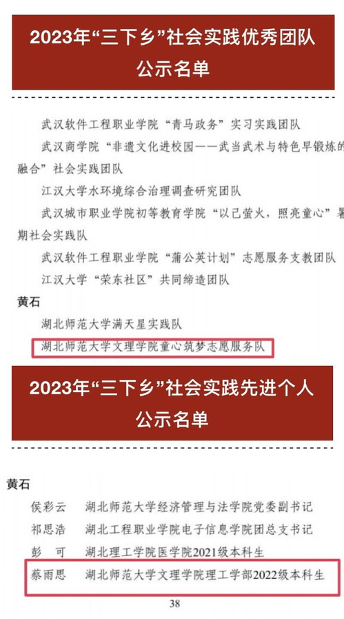 (通讯员:王梓千寻)湖北省大中专学生志愿者暑期文化科技卫生“三下乡”社会实践活动总结通报结果已公布。米乐官方网页版_米乐(中国)童心筑梦志愿服务队被评为“三下乡”社会实践优秀团队,理工学部2022级本科生蔡雨思同学被评为“三下乡”社会实践先进个人。